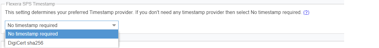Under the Flexera SPS Timestamp drop-down menu, you can select the default “No timestamp required” option or the appropriate timestamp provider.