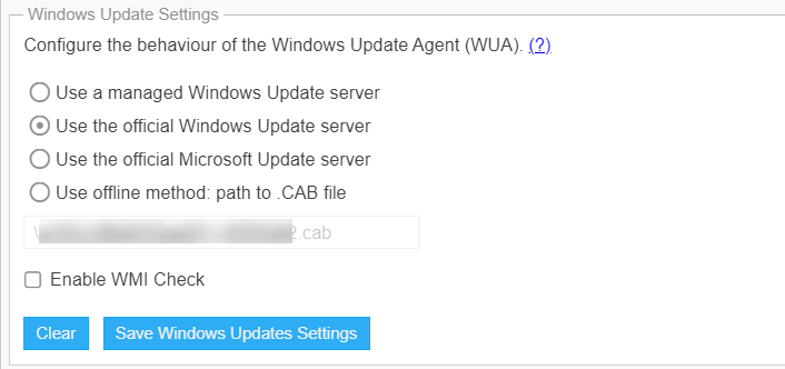 The Windows Update Settings control the behavior of the Windows Update Agent (WUA) used by Software Vulnerability Manager and the Software Vulnerability Manager Agent (csia.exe) to retrieve update information on Windows and other Microsoft products. Each update setting is further explained below.
