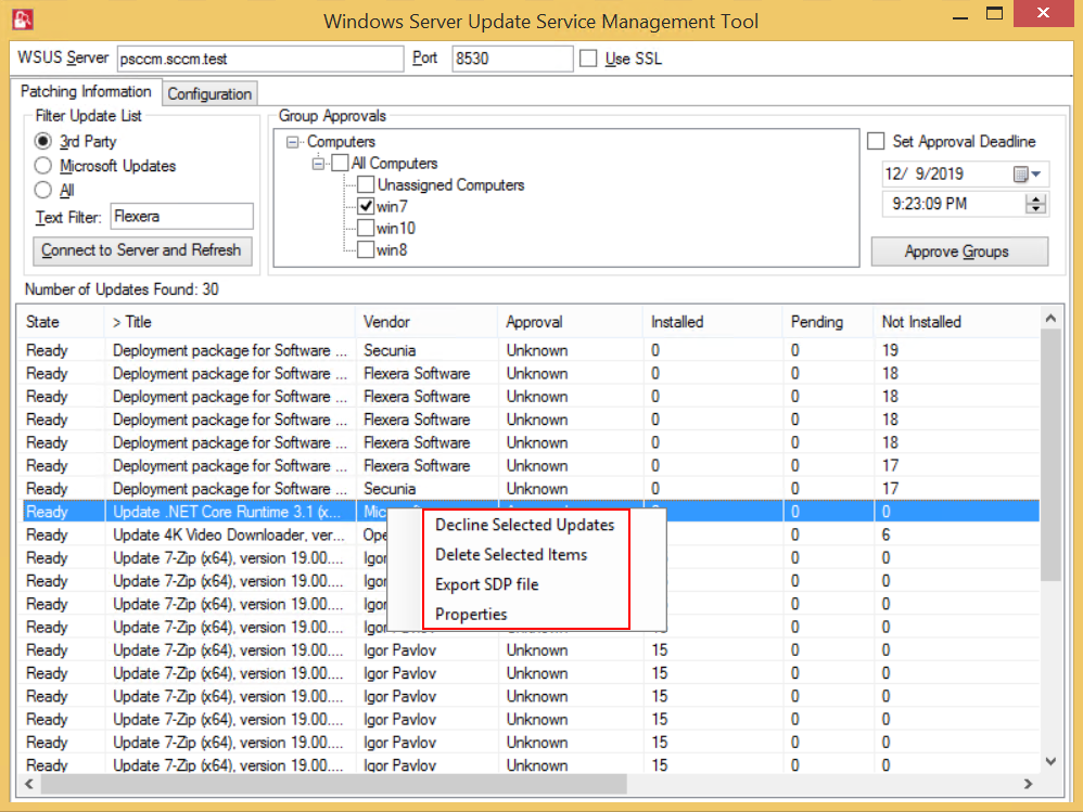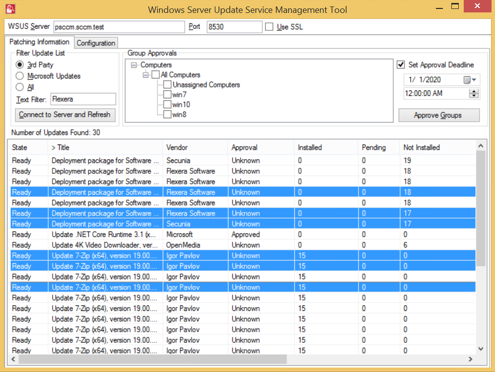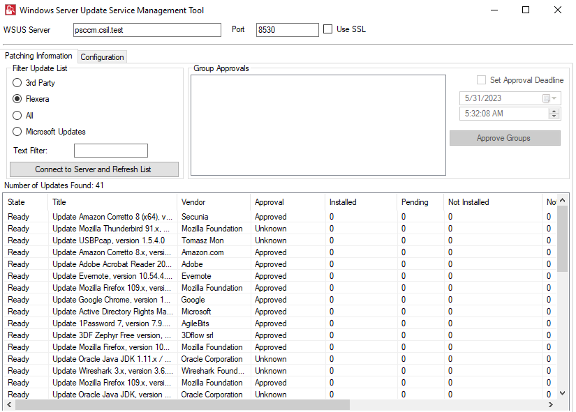 If you select the Flexera filter option and click the Connect to Server and Refresh List button, you will see the list of patches published to the WSUS from the SVM Patch Publisher/SVM console.