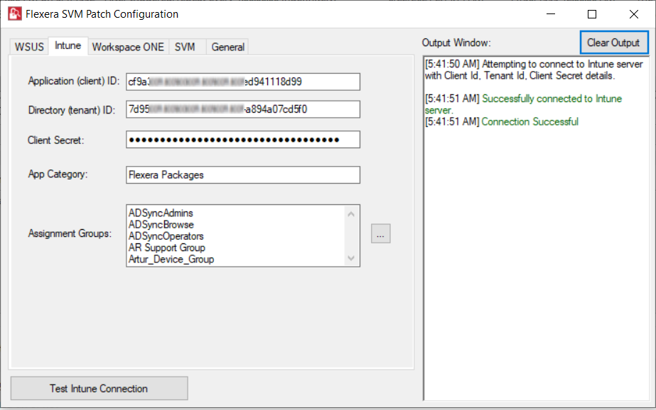 8. Click Test Intune Connection button, on successful connection you will receive a successful message in the Output Window.