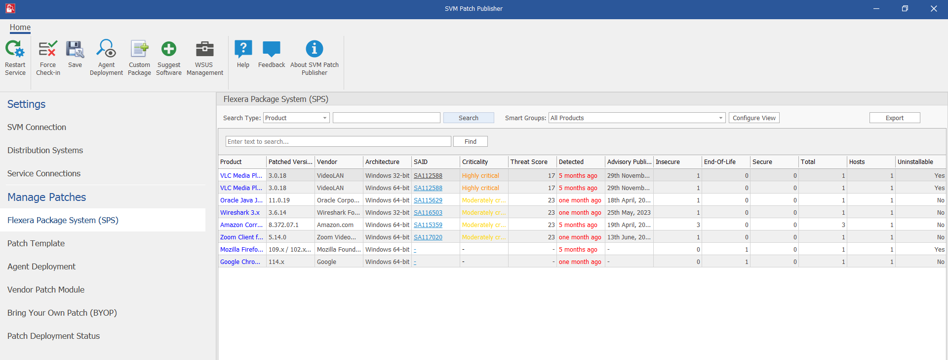 The Flexera Package System (SPS) page displays a list of products for which Software Vulnerability Manager can automatically create an Update/Uninstall package.