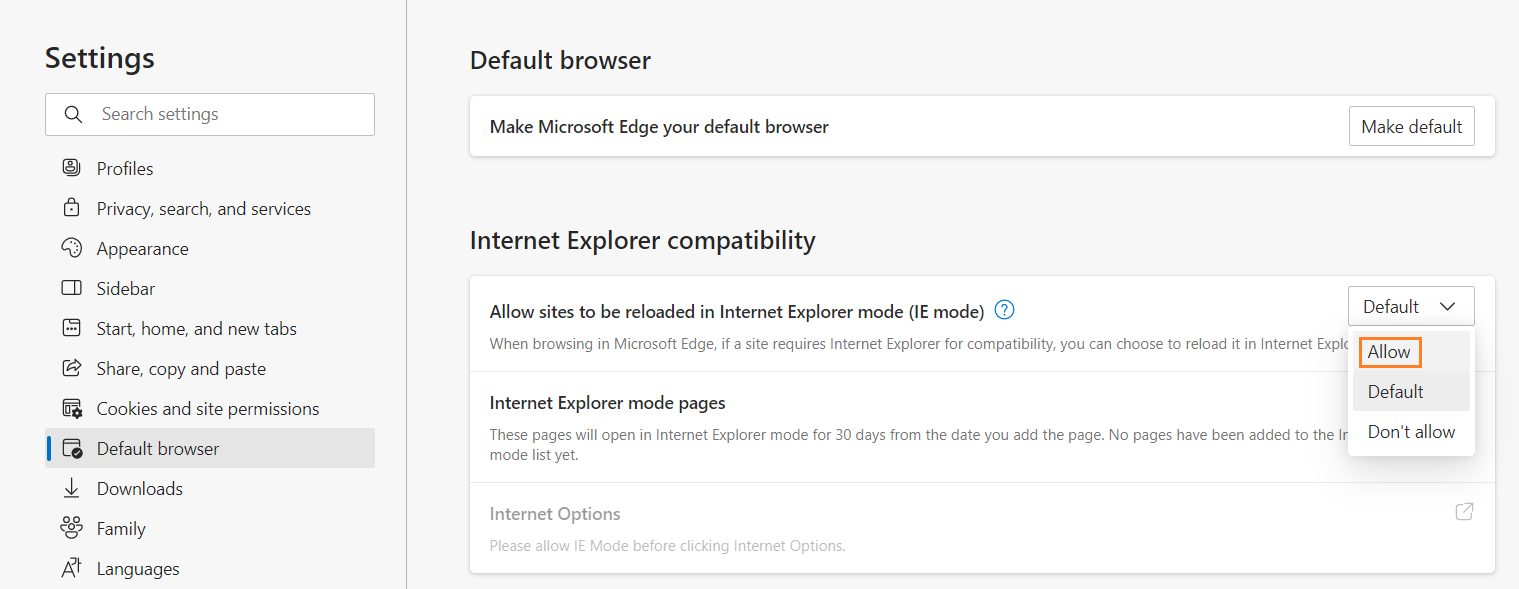 3. In the Default browser page, slide the Allow sites to be reloaded in Internet Explorer mode (IE mode) toggle to Allow.
