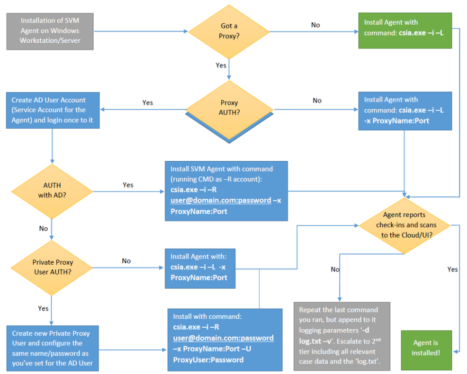 You should use this logic flow to match the correct way to set up your Agent based on the networking requirements of your estate. -L symbolizes installation under "LocalSystem" while -R symbolizes "RunAs" installation under a managed domain service account.