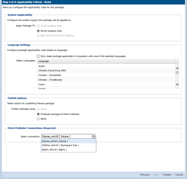 To publish a package through the Patch Publisher, select the Publish Options > Schedule package to Patch Publisher , and then select the required connection from the Patch Publisher Connections (Required) drop down.