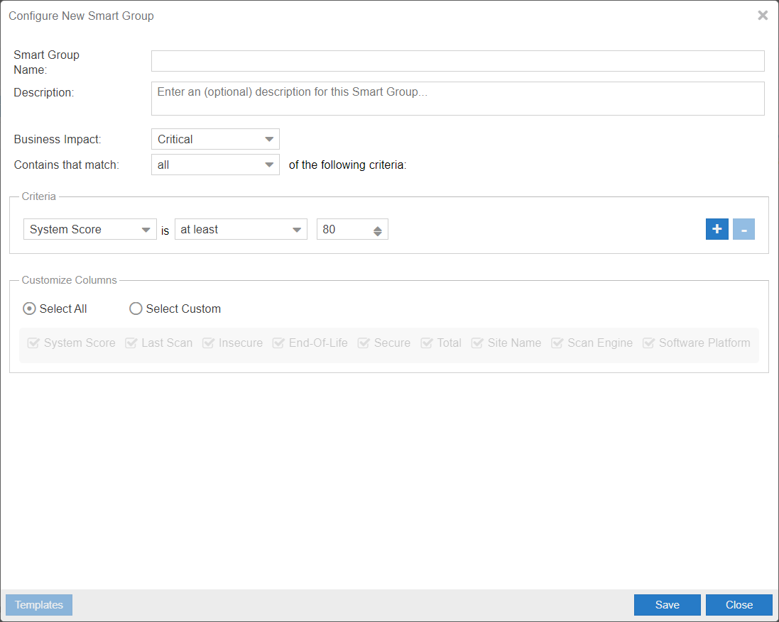 Smart Group Criteria Description System Score Filter by system score. For more information, see System Score Settings. System Platform Filter by system platform. Last Scan Date Filter by last scan date of the host. Site Filter by site name. Host Filter by host name. Missing KB Article Filter hosts with missing Microsoft KB article. CVE Number Filter host by CVE Number from selected CVE list. Host Name Filter host name using begins with, starts with, and contains condition. This filter supports options like contains,starts with,does not contain, andequals. Then enter the Host name in the text field.Site Name Filter site name using begins with, starts with, and contains condition. This filter supports options like contains,starts with,does not contain, andequals. Then enter the Site name in the text field.Operating System Filter by operating system from selected list. Operating System Build Filter by specific version of the Operating System. For more details, see Filter Host Smart Groups on Operating System Build Version. -