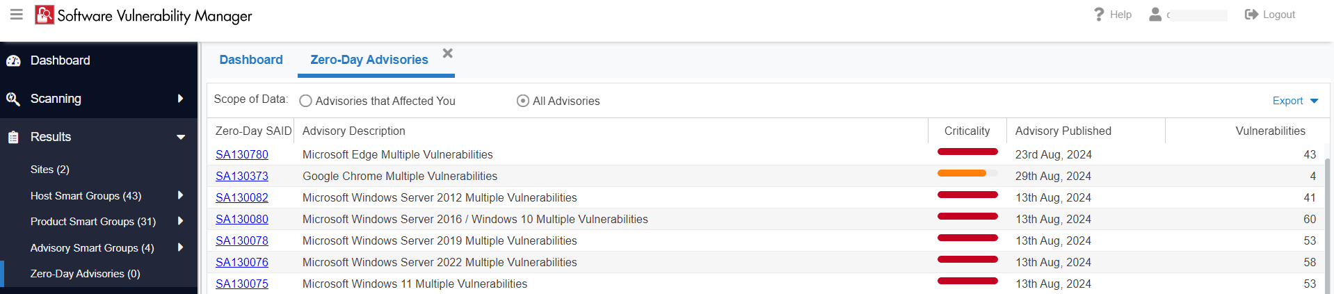 - Shows a filtered list of zero-day advisories that have specifically impacted your environment.